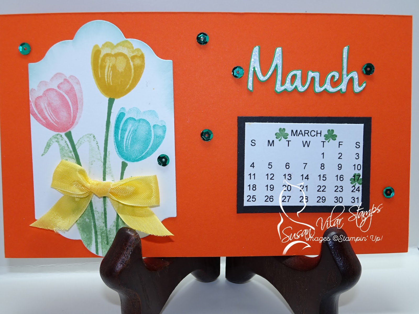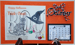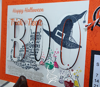 October features a new technique called the Eclipse Technique. Stamp all the background images you wish, then use the Stampin' Up Large Letters to die cut BOO or any other saying you wish! Cut 2 additional black letters to give some depth. The black letters mounted behind the top letters will allow you to see your raised lettering much more easily.