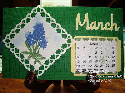 March's calendar page is cut with Designer's Calendar. The medallion is edged with a Martha Stewart PATP punch set. Since the bluebonnets bloom in Texas in March, I just has to use one of my newest Kitchen Sink Stamp sets - Bluebonnets! The background Versamarked image is a Stampin' Up wheel; called Field of Daisies.